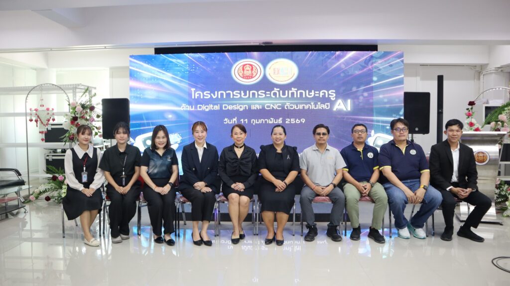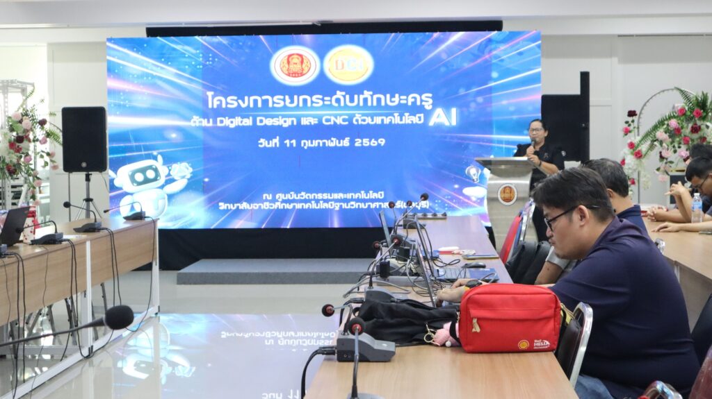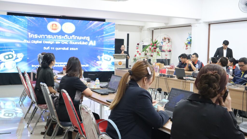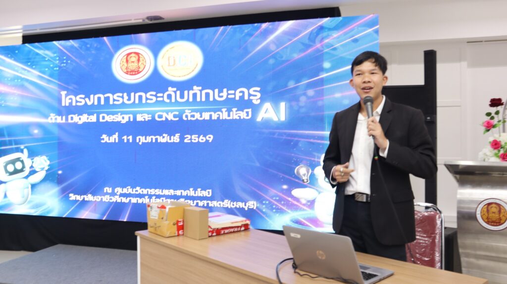 นางนิตยา เสาหงษ์ รองผู้อำนวยการ รักษาการในตำแหน่ง ผู้อำนวยการวิทยาลัยอาชีวศึกษาเทคโนโลยีฐานวิทยาศาสตร์ (ชลบุรี ) กล่าวต้อนรับคณะครูที่เข้าร่วมการออกแบบ Digital Design & CNC ด้วยเทคโนโลยี AIฐานวิทยาศาสตร์ชลบุรี เชิญชวนครูเข้าร่วมอบรมการออกแบบ Digital Design & CNC ด้วยเทคโนโลยี AI และได้รับเกียรติจาก ดร.ปัทมา คุณสืบพงษ์พันธ์ ผู้อำนวยการโรงเรียนพงศ์สิริวิทยา ชลบุรี เข้าร่วมอบรม พร้อมเยี่ยมชมการจัดการเรียนการสอนของทุกแผนกวิชา การอบรมในครั้งนี้ มีครูธัญพิสิษฐ์ เนื่องจำนงค์ เป็นวิทยากรในการปฎฺิบัติในครั้งนี้ จัดขึ้น ณ ห้องประชุมชั้น 2 อาคารนวัตกรรม