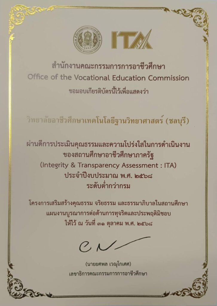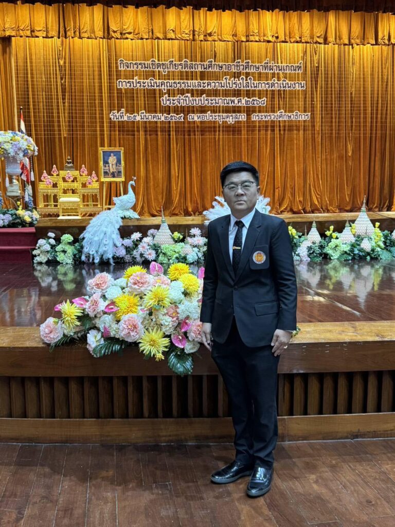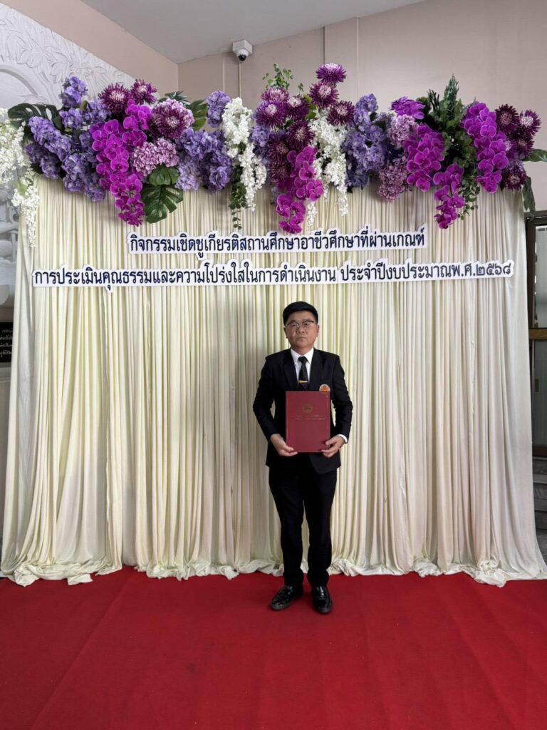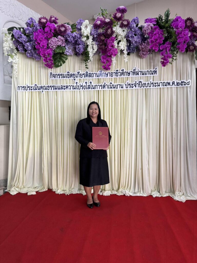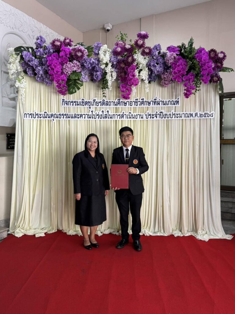 ผู้อำนวยการเข้ารับเกียรติติบัตรเชิดชูเกียรติในกิจกรรมเชิดชูเกียรติสถานศึกษาอาชีวศึกษาที่ผ่านเกณฑ์การประเมินคุณธรรมและความโปร่งใสในการดำเนินงานประจำปีงบประมาณ 2568