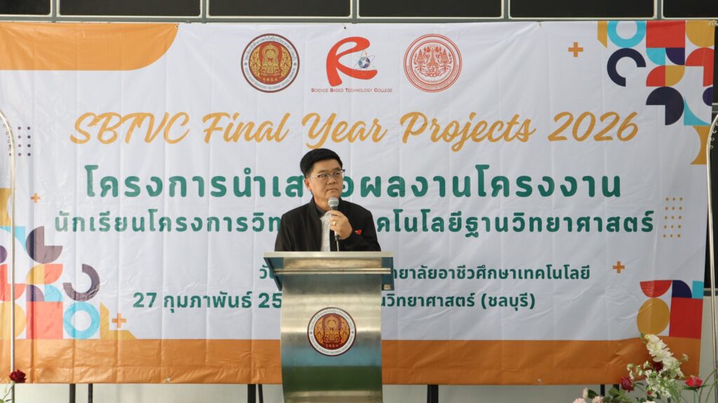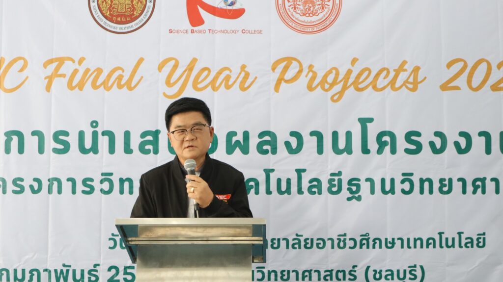ดร. อภิชาติ อนุกูลเวช ผู้อำนวยการวิทยาลัยอาชีวศึกษาเทคโนโลยีฐานวิทยาศาสตร์ (ชลบุรี) เป็นประธานเปิดโครงการนำเสนอผลงานโครงงานนักเรียนโครงการวิทยาลัยเทคโนโลยีฐานวิทยาศาสตร์