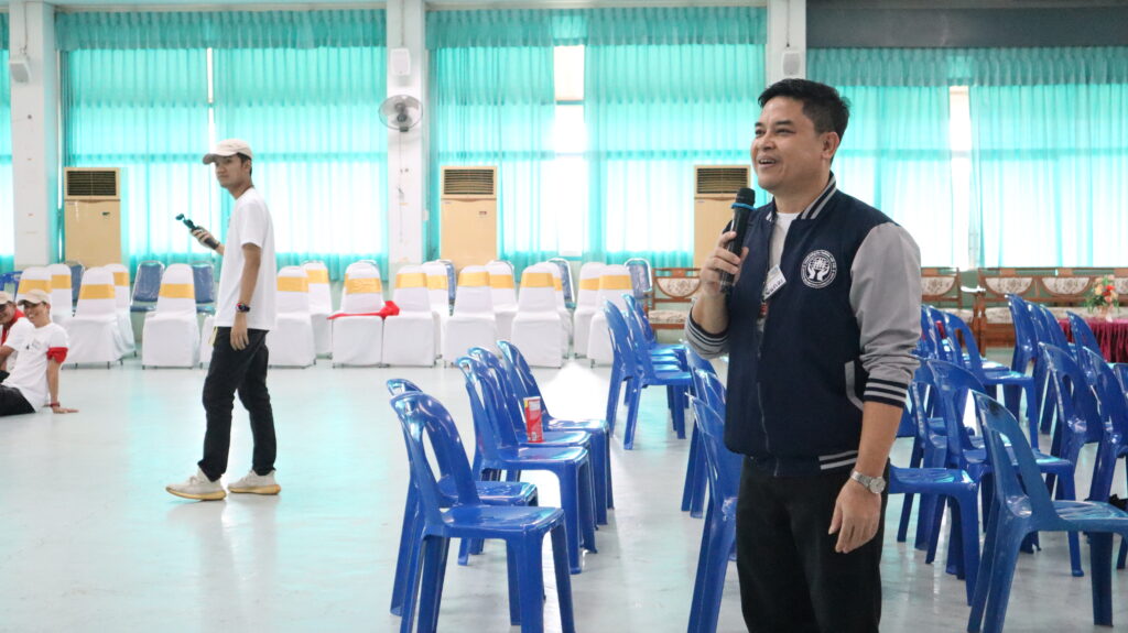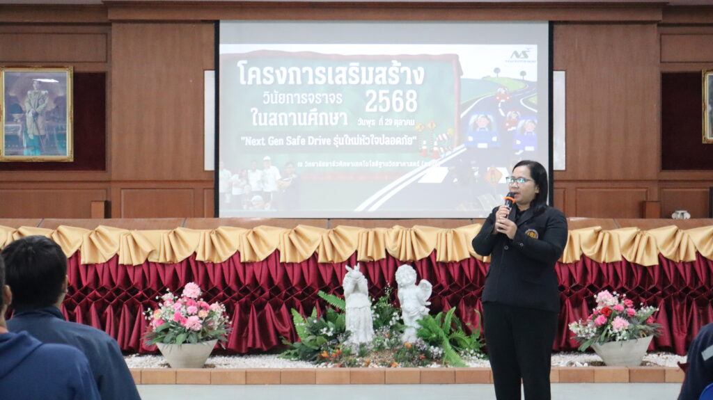 นางนิตยา เสาหงษ์ รองผู้อำนวยการรักษาการในตำแหน่ง ผู้อำนวยการวิทยาลัยอาชีวศึกษาเทคโนโลยีฐานวิทยาศาสตร์ (ชลบุรี) กล่าวต้อนรับในพิธีเปิดโครงการเสริมสร้างวินัยจราจร ในสถานศึกษา 2568 “Next Gen Safe Drive รุ่นใหม่หัวใจปลอดภัย”